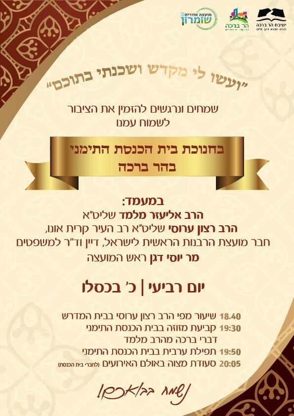הערב (ד') נחנך בית כנסת חדש בקרית הישיבה בהר ברכה עבור המנין בנוסח יהודי תימן הפועל מזה 15 שנים בישיבה בשבתות ובחגים.